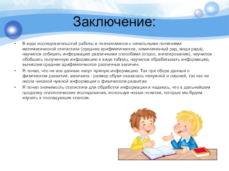 Я понял значимость статистики для обработки информации и надеюсь, что в дальнейшем продолжу статистические исследования, используя новые понятия, которые мы будем изучать в последующих классах.