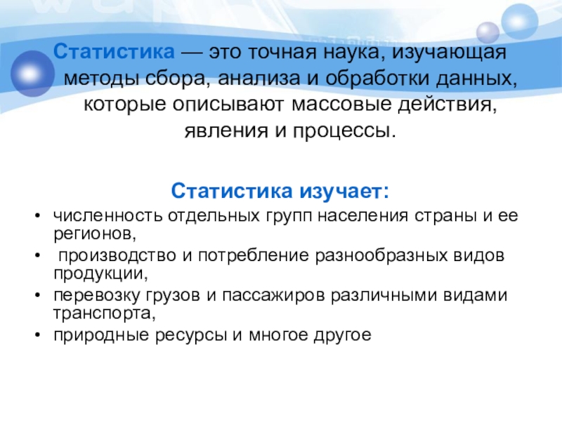 Слайд 3Статистика — это точная наука, изучающая методы сбора, анализа и обработки