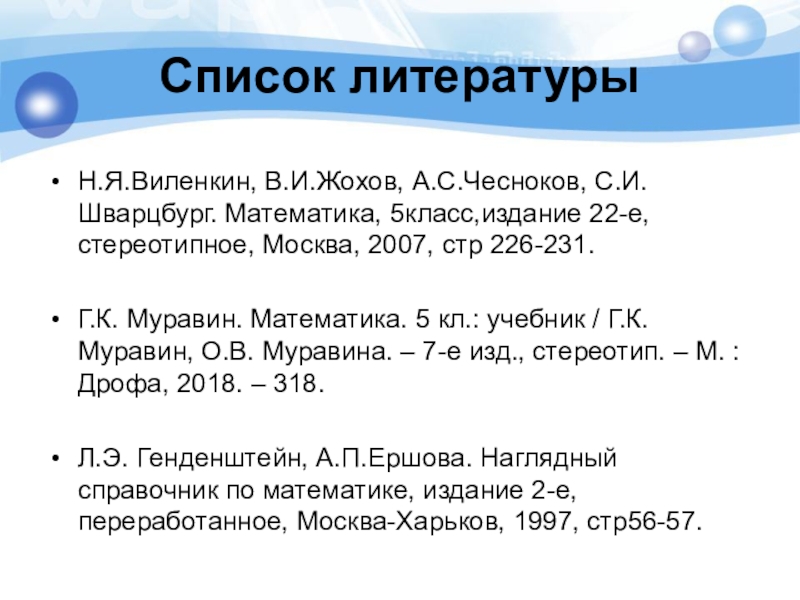 Г.К. Муравин. Математика. 5 кл.: учебник / Г.К. Муравин, О.В. Муравина. – 7-е изд., стереотип. – М. : Дрофа, 2018. – 318.