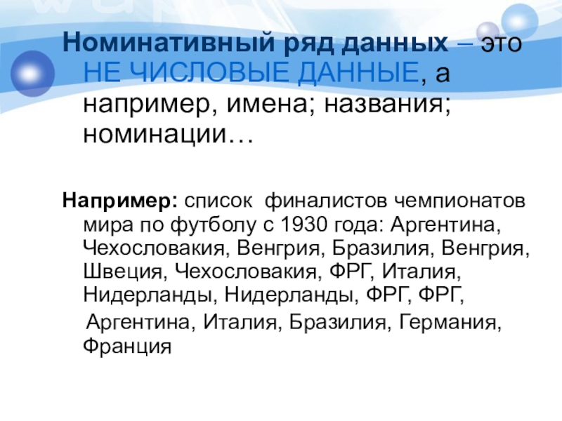Слайд 9Номинативный ряд данных – это НЕ ЧИСЛОВЫЕ ДАННЫЕ, а например, имена;