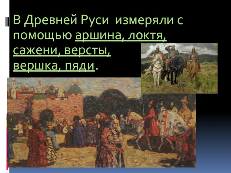 Слайд 7В Древней Руси измеряли c помощью аршина, локтя, сажени, версты,