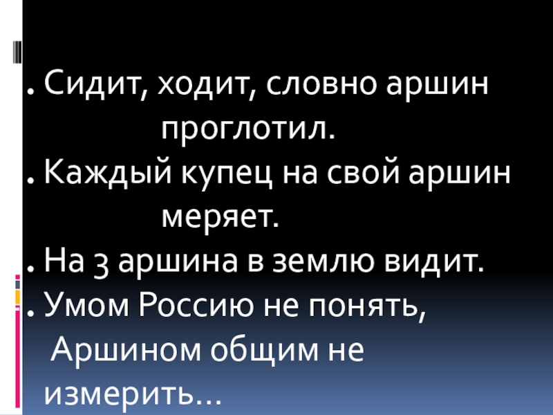 Сидит, ходит, словно аршин 							проглотил.Каждый купец на свой аршин 							меряет.На 3 аршина в землю видит.Умом Россию не
