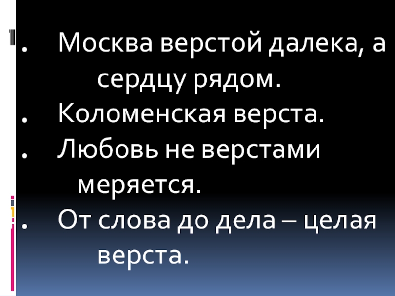 Москва верстой далека, а 		сердцу рядом.Коломенская верста.Любовь не верстами 				меряется.От слова до дела – целая 		верста.