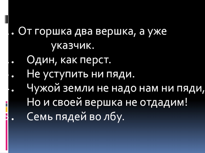 От горшка два вершка, а уже 									указчик.Один, как перст.Не уступить ни пяди.Чужой земли не надо нам ни