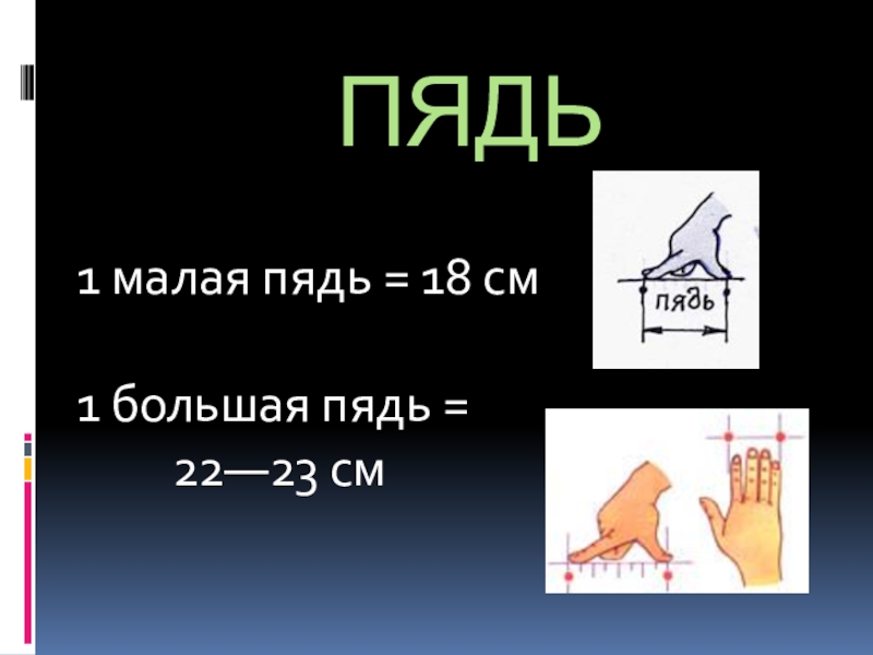 1 малая пядь = 18 см1 большая пядь =     22—23 см