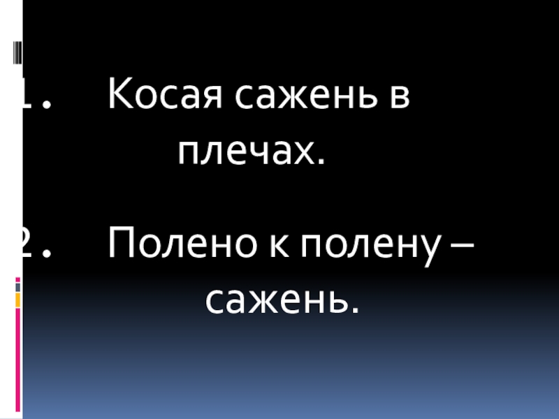 Косая сажень в 								плечах.Полено к полену – 							сажень.