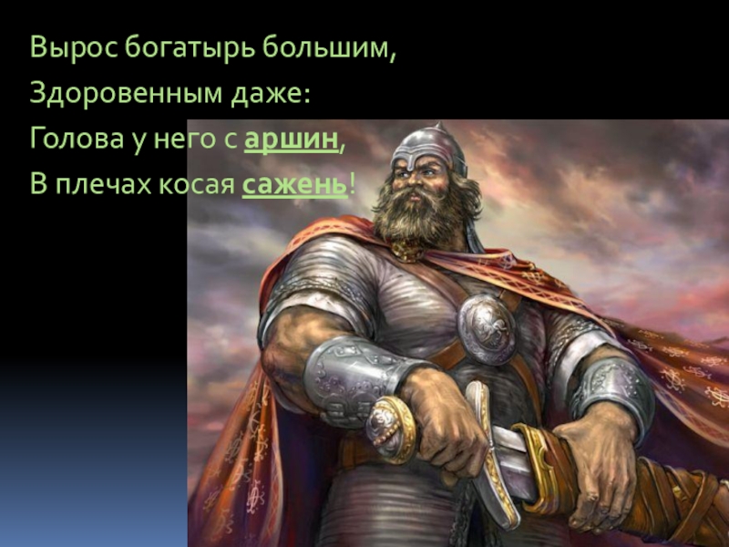 Вырос богатырь большим, Здоровенным даже:Голова у него с аршин,В плечах косая сажень!