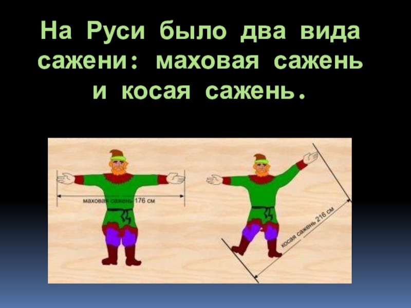 Слайд 11На Руси было два вида сажени: маховая сажень и косая сажень.