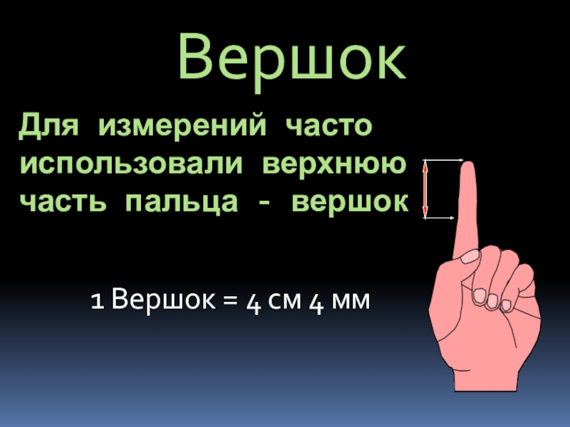 Для измерений часто использовали верхнюю часть пальца - вершок1 Вершок = 4 см 4 ммВершок