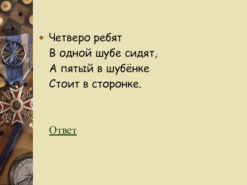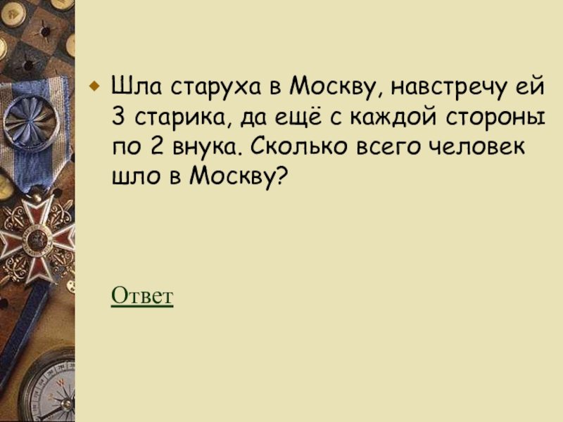 Шла старуха в Москву, навстречу ей 3 старика, да ещё с