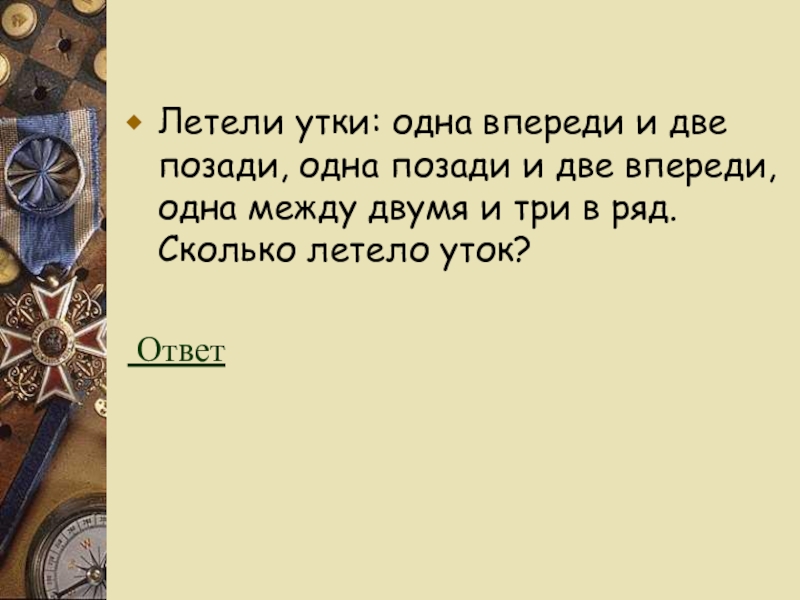 впереди, одна между двумя и три в ряд. Сколько летело уток?
