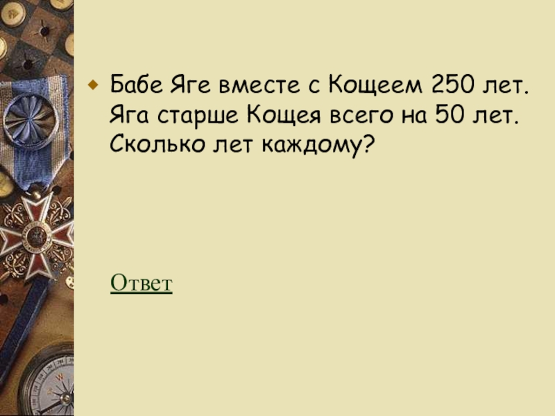 Бабе Яге вместе с Кощеем 250 лет. Яга старше Кощея всего
