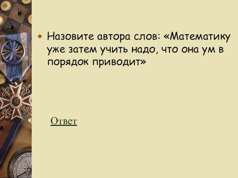 Назовите автора слов: «Математику уже затем учить надо, что она ум