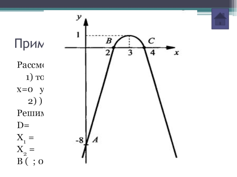 Пример Рассмотрим функцию у(х)= -х2 + 6х – 8  1) точки пересечения с осью Ох х=0
