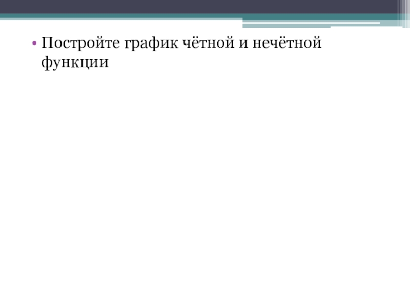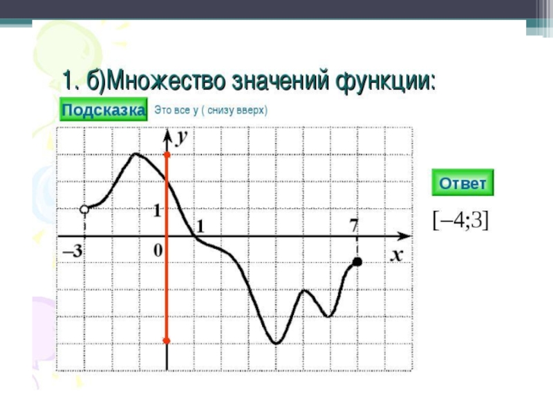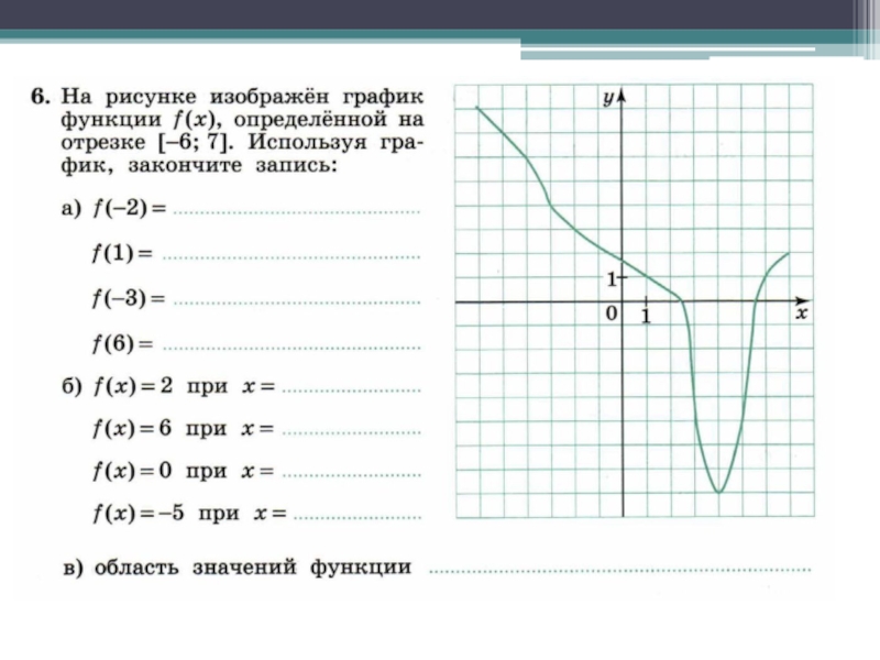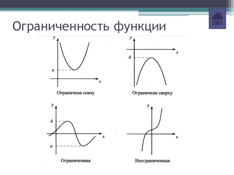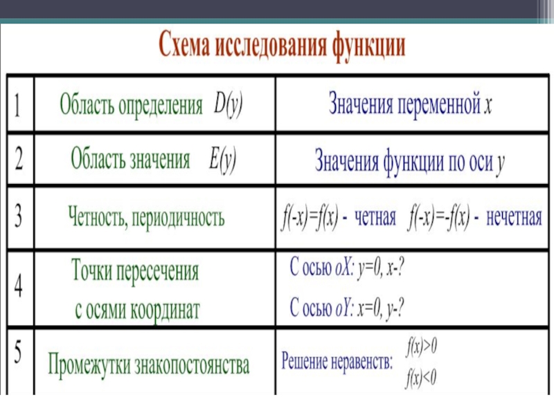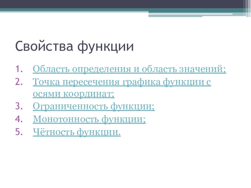Свойства функцииОбласть определения и область значений;Точка пересечения графика функции с осями координат;Ограниченность функции;Монотонность функции;Чётность функции.
