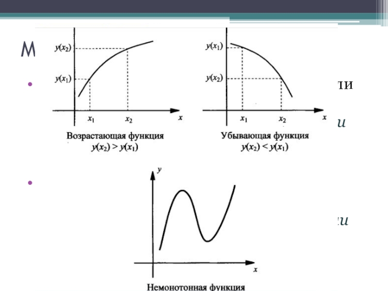 Монотонность Функция называется возрастающей, если большему значению аргумента соответствует большее значение функции (т.е если х2 > x1