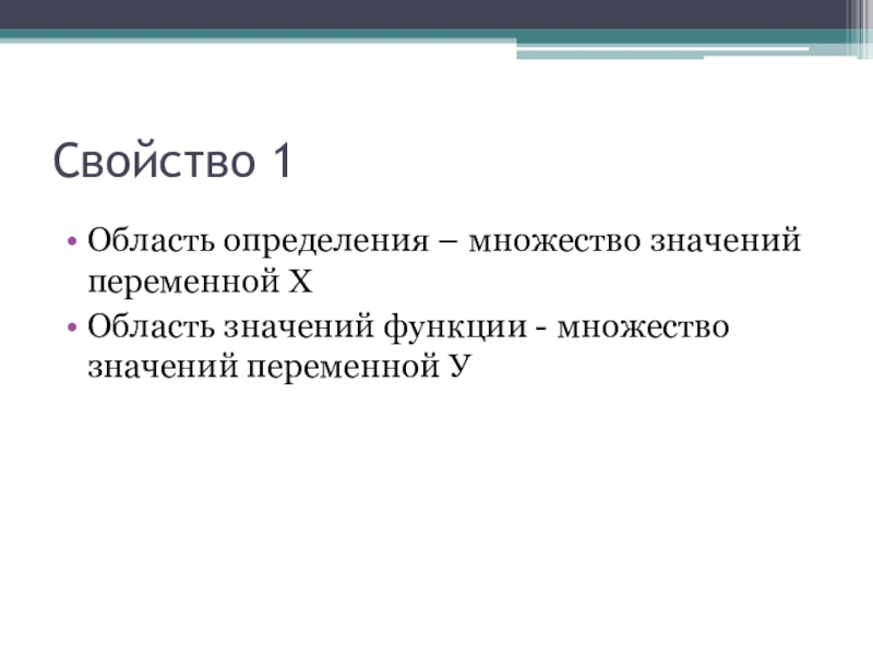 Свойство 1Область определения – множество значений переменной ХОбласть значений функции - множество значений переменной У