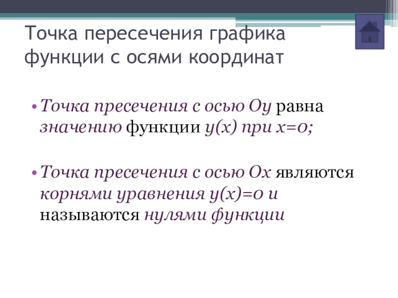 Точка пересечения графика функции с осями координат Точка пресечения с осью Оу равна значению функции у(х) при