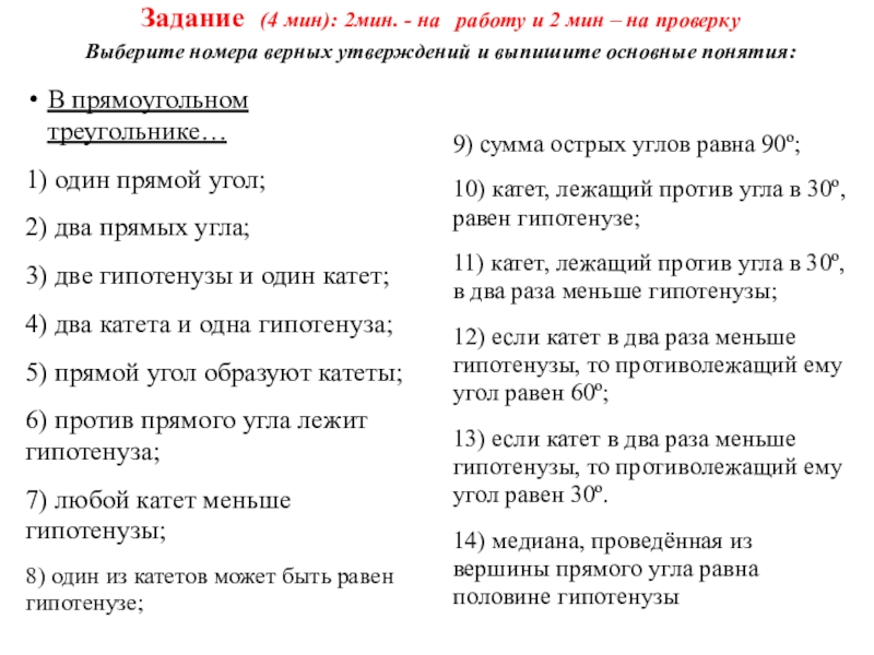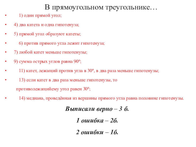 10) катет, лежащий против угла в 30º, равен гипотенузе;