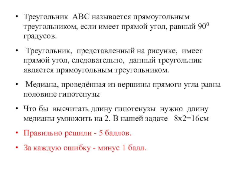 14) медиана, проведённая из вершины прямого угла равна половине гипотенузы
