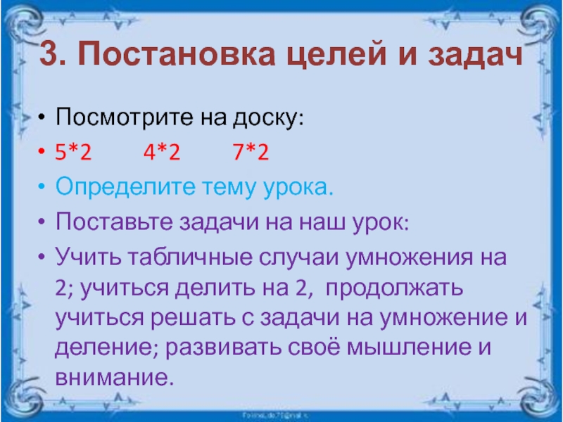 3. Постановка целей и задачПосмотрите на доску:5*2     4*2     7*2Определите