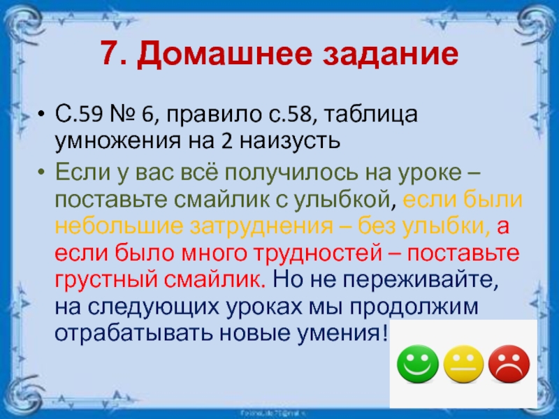 7. Домашнее заданиеС.59 № 6, правило с.58, таблица умножения на 2 наизустьЕсли у вас всё получилось на