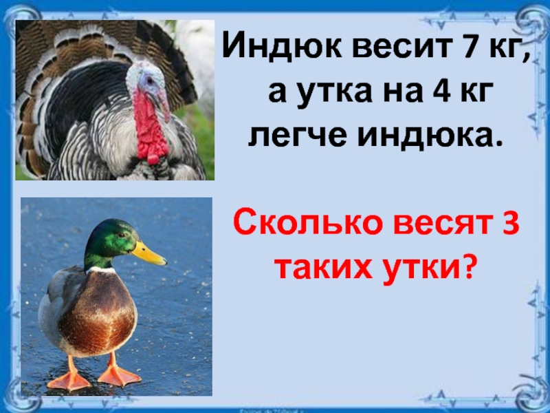Индюк весит 7 кг, а утка на 4 кг легче индюка.Сколько весят 3 таких утки?
