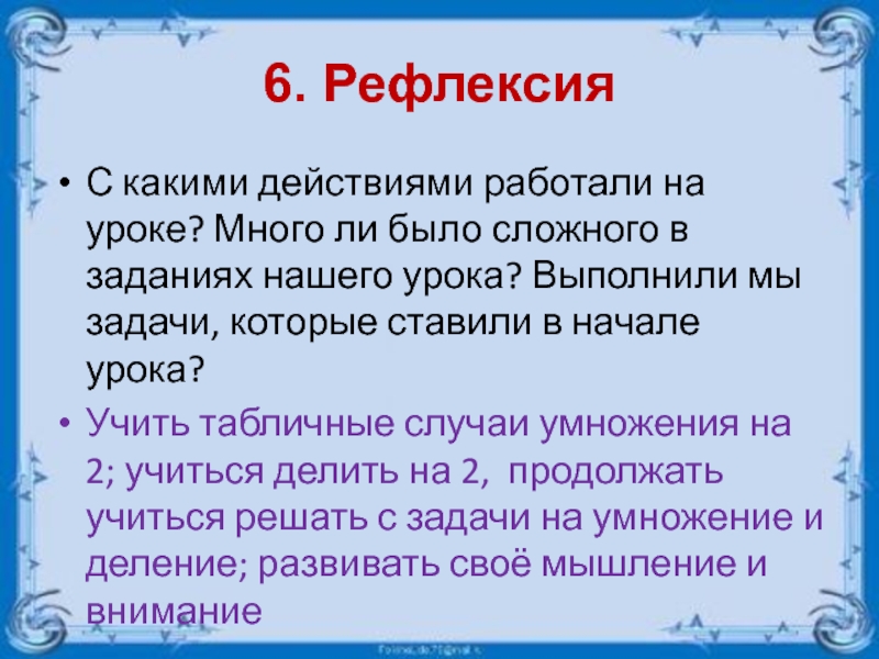 6. РефлексияС какими действиями работали на уроке? Много ли было сложного в заданиях нашего урока? Выполнили мы