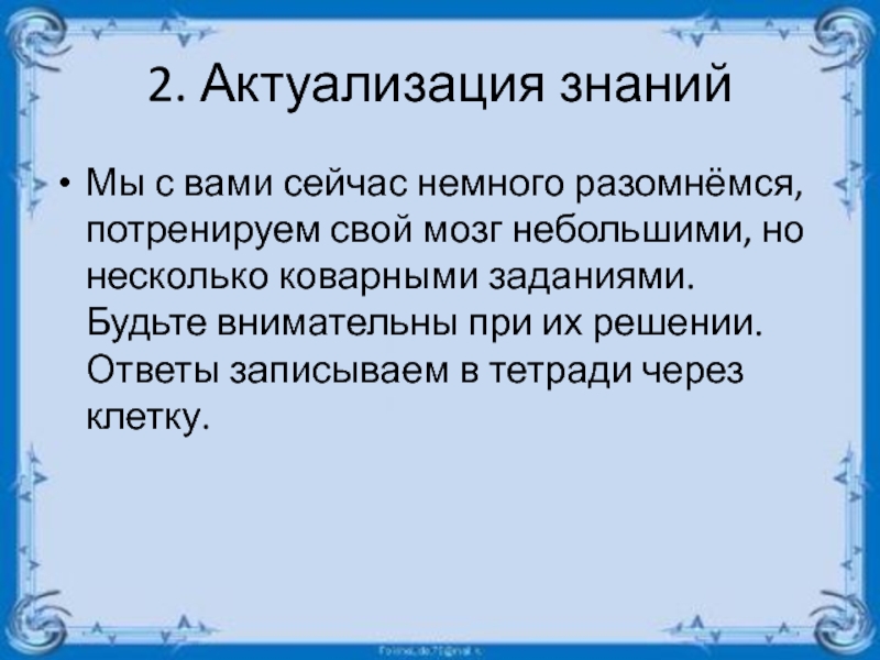 2. Актуализация знанийМы с вами сейчас немного разомнёмся, потренируем свой мозг небольшими, но несколько коварными заданиями. Будьте