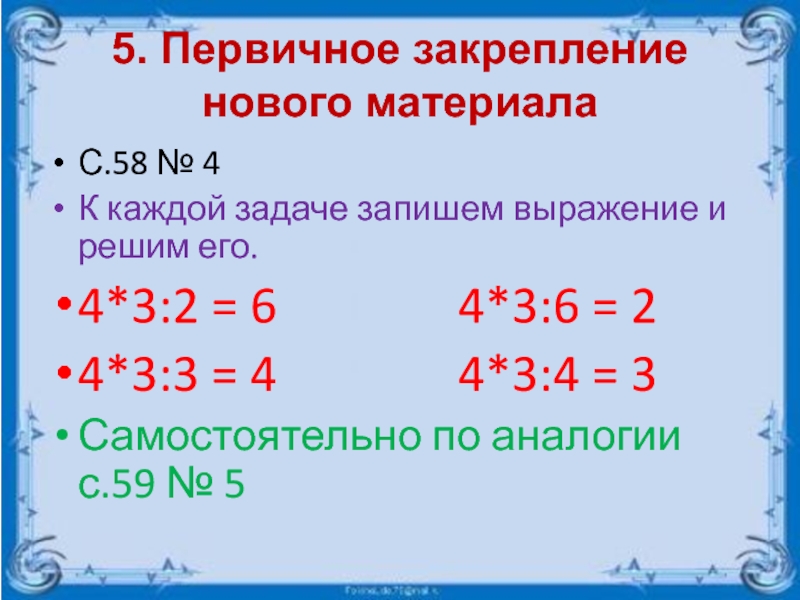 5. Первичное закрепление нового материалаС.58 № 4К каждой задаче запишем выражение и решим его. 4*3:2 = 6