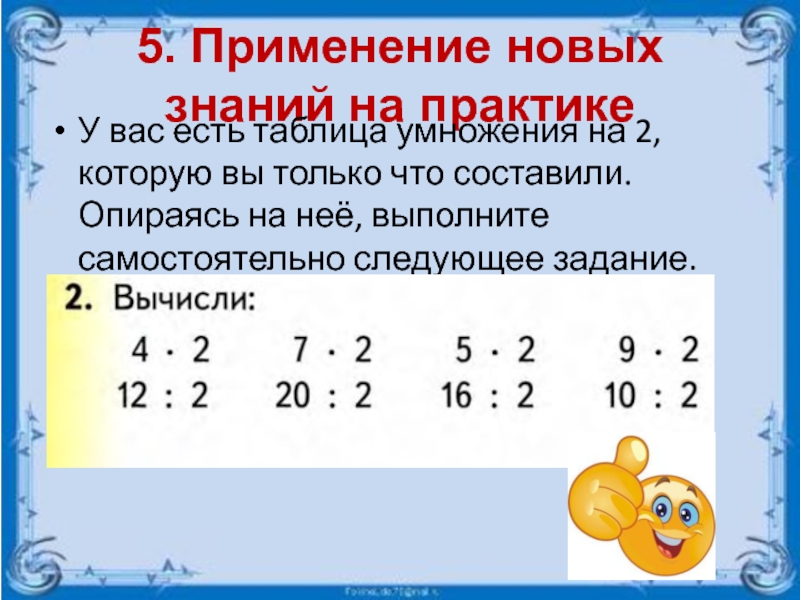 5. Применение новых знаний на практикеУ вас есть таблица умножения на 2, которую вы только что составили.
