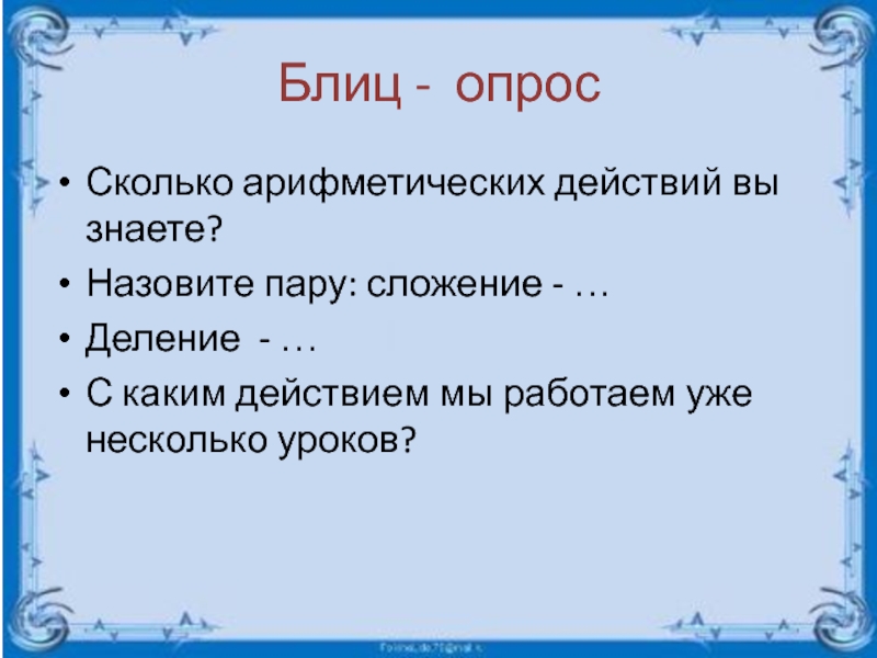 Блиц - опросСколько арифметических действий вы знаете?Назовите пару: сложение - …Деление - …С каким действием мы работаем