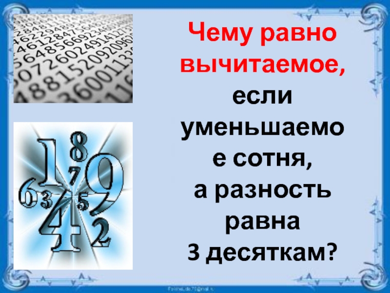 Слайд 6Чему равно вычитаемое, если уменьшаемое сотня,
