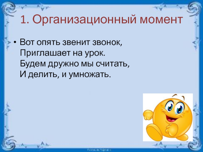 1. Организационный моментВот опять звенит звонок, Приглашает на урок. Будем дружно мы считать, И делить, и умножать.