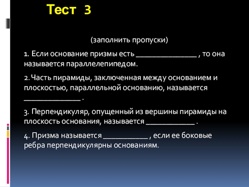 4. Призма называется ___________ , если ее боковые ребра перпендикулярны основаниям.