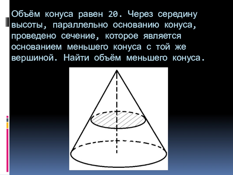 Слайд 14Объём конуса равен 20. Через середину высоты, параллельно основанию конуса, проведено