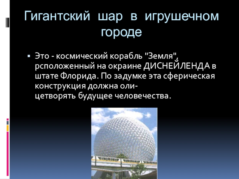 окраине ДИСНЕЙЛЕНДА в штате Флорида. По задумке эта сферическая конструкция должна оли- цетворять будущее человечества.