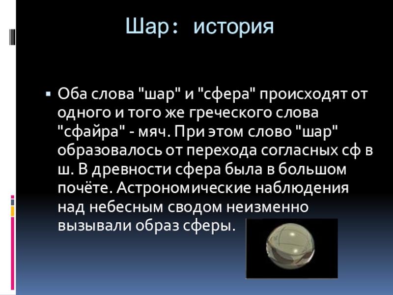 же греческого слова "сфайра" - мяч. При этом слово "шар" образовалось от перехода согласных сф в ш. В древности сфера была в большом почёте. Астрономические наблюдения над небесным сводом неизменно вызывали образ сферы.