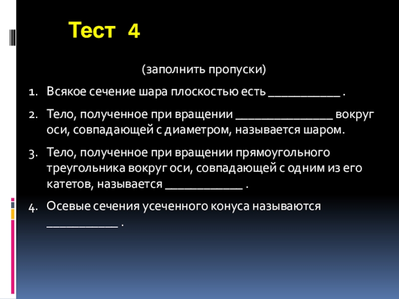 вращении _______________ вокруг оси, совпадающей с диаметром, называется шаром.