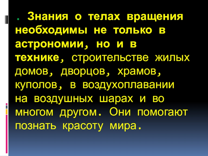 в технике, строительстве жилых домов, дворцов, храмов, куполов, в воздухоплавании на воздушных шарах и во многом другом. Они помогают познать красоту мира.