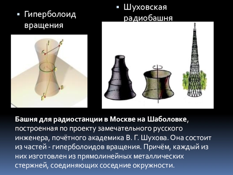 по проекту замечательного русского инженера, почётного академика В. Г. Шухова. Она состоит из частей - гиперболоидов вращения. Причём, каждый из них изготовлен из прямолинейных металлических стержней, соединяющих соседние окружности.