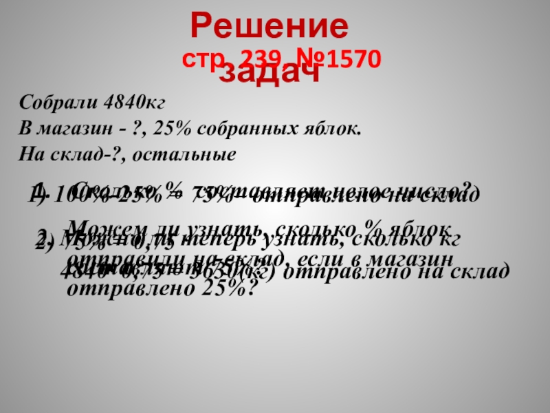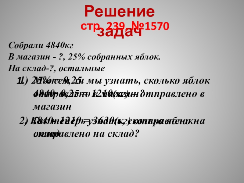 4840· 0,25 = 1210(кг) – отправлено в магазин