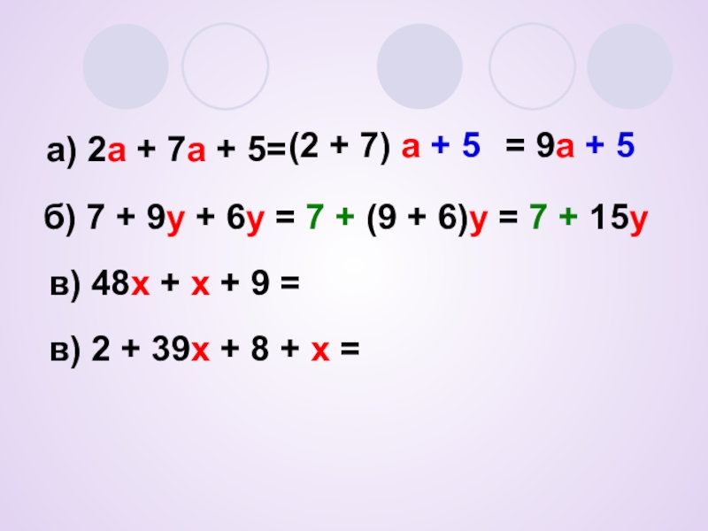 б) 7 + 9у + 6у = 7 + (9 + 6)у = 7 + 15у