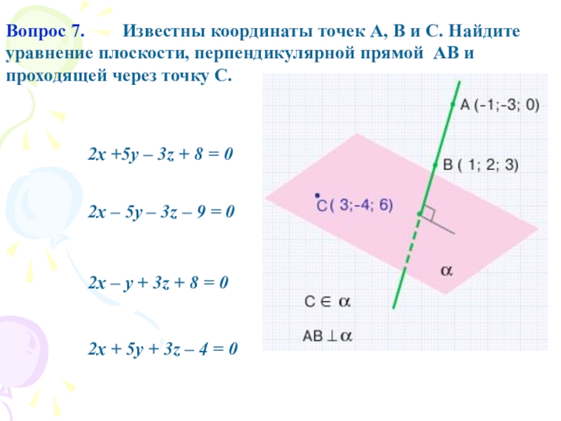 Вопрос 7. Известны координаты точек А, В и С. Найдите уравнение плоскости, перпендикулярной прямой АВ и проходящей через точку С.