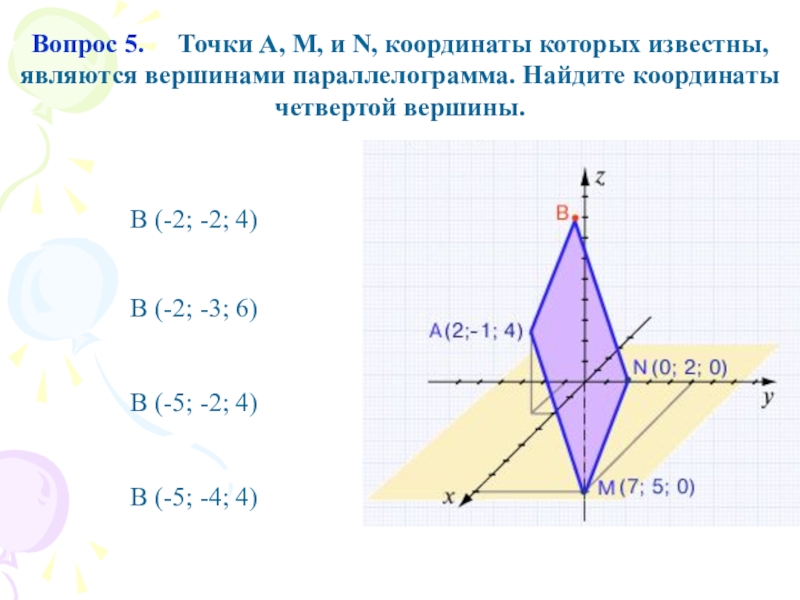 Вопрос 5. Точки А, М, и N, координаты которых известны, являются вершинами параллелограмма. Найдите координаты четвертой вершины.