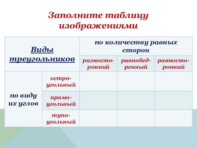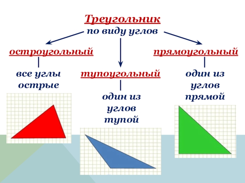 Треугольник по виду угловостроугольныйпрямоугольныйтупоугольныйвсе углы острыеодин из углов тупойодин из углов прямой