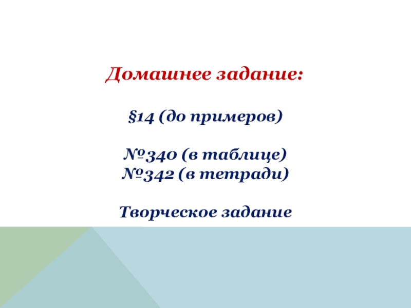 Домашнее задание:§14 (до примеров)№340 (в таблице)№342 (в тетради)Творческое задание