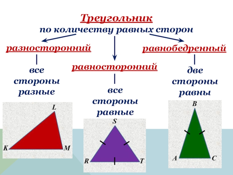 Треугольник по количеству равных сторонразностороннийравнобедренныйравностороннийвсе стороны разныевсе стороны равныедве стороны равныACBLKMSRT
