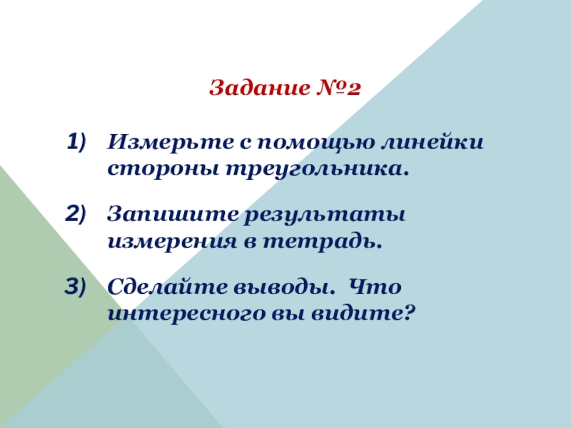 Задание №2Измерьте с помощью линейки стороны треугольника.Запишите результаты измерения в тетрадь.Сделайте выводы. Что интересного вы видите?