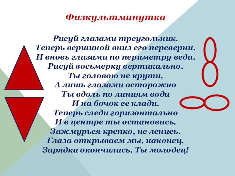 ФизкультминуткаРисуй глазами треугольник.Теперь вершиной вниз его переверни.И вновь глазами по периметру веди.Рисуй восьмерку вертикально.Ты головою не крути,А